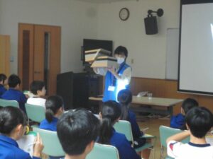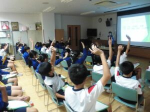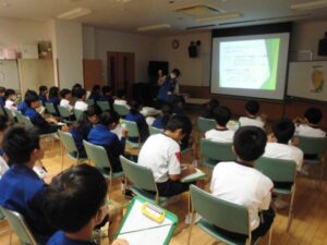 立山黒部ジオパーク協会より講師の先生にお越しいただき、富山県や魚津市周辺の地形の話を交えながらのお話に子供たちは興味をもって話を聞いていました。