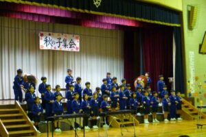 歌「あおいそらにえをかこう」や合奏「村まつり」などを披露しました。