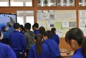 全校児童で、写真で振り返りながら不審者が侵入した際の動きを確認しました。